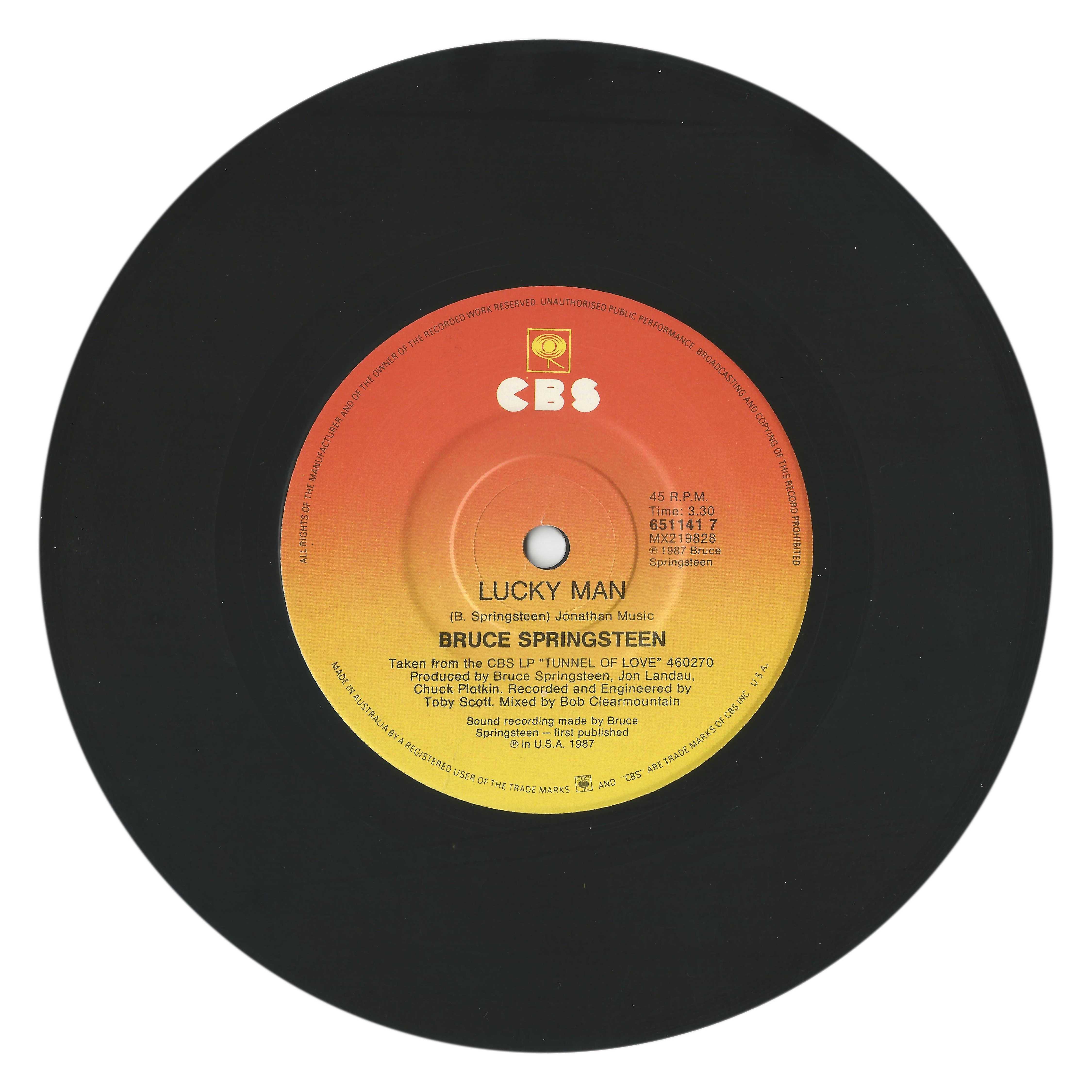 Label info: Orange/yellow “sunburst” CBS promo paper labels; small center hole