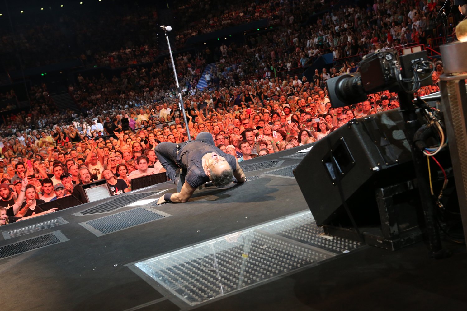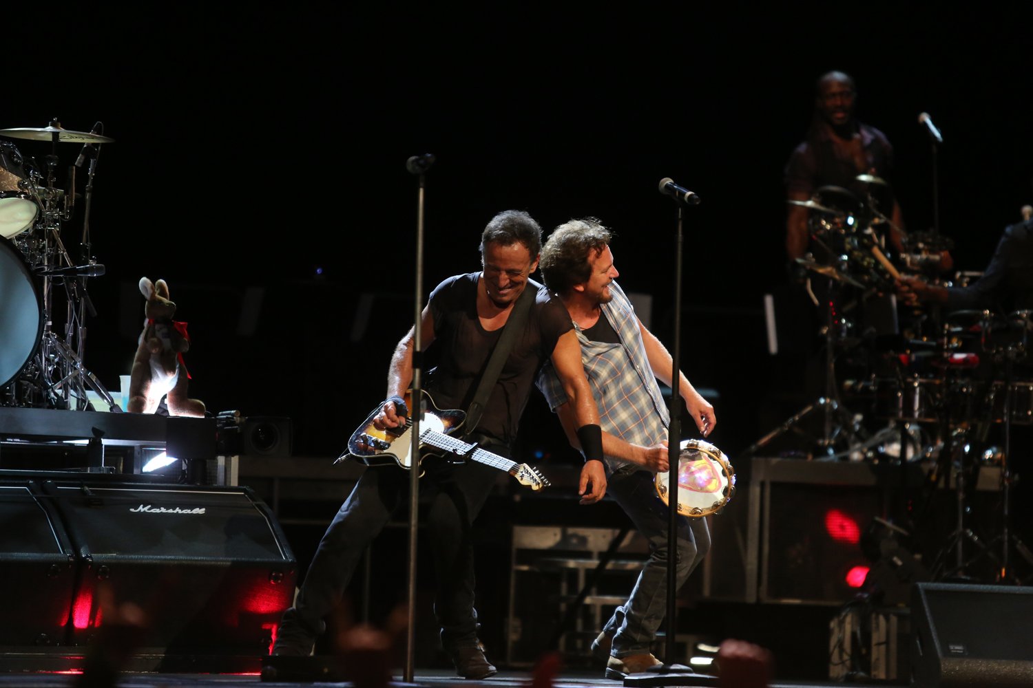 At the album’s close Bruce shifts into a new gear and hits the stalls to shake a few hands, plant a kiss on the woman in the balcony and delight us with Darlington County. Waiting On A Sunny Day keeps the mood upbeat. The Rising is one of the nights many standouts and The Ghost Of Tom Joad is played with a zeal that clearly impresses as the audience bellow the hook line louder than any other audience in the county. Badlands is next and if you were in the pit and you thought an audience member was banging an extra tambourine, you were right. Eddie Vedder was right there shaking his tambo as hard as he could. Glory Days (with a ‘let’s twerk’ adlib was next).