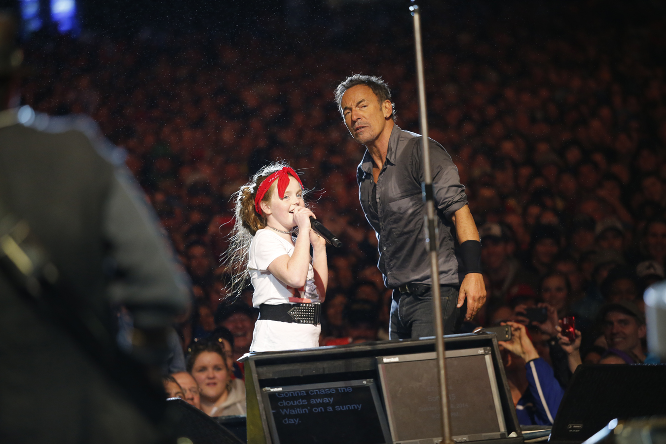 “Shackled and Drawn” has come a long way since it first debuted on the Wrecking Ball tour. Cindy Mizelle’s voice is just stunning. With the rain coming down, “Waitin’ on a Sunny Day” seemed appropriate for the evening, and one of many small kids dressed like Bruce circa 1984 got to sing with Bruce. She continued to sing as he carried her back to her family, getting a chuckle from Springsteen.