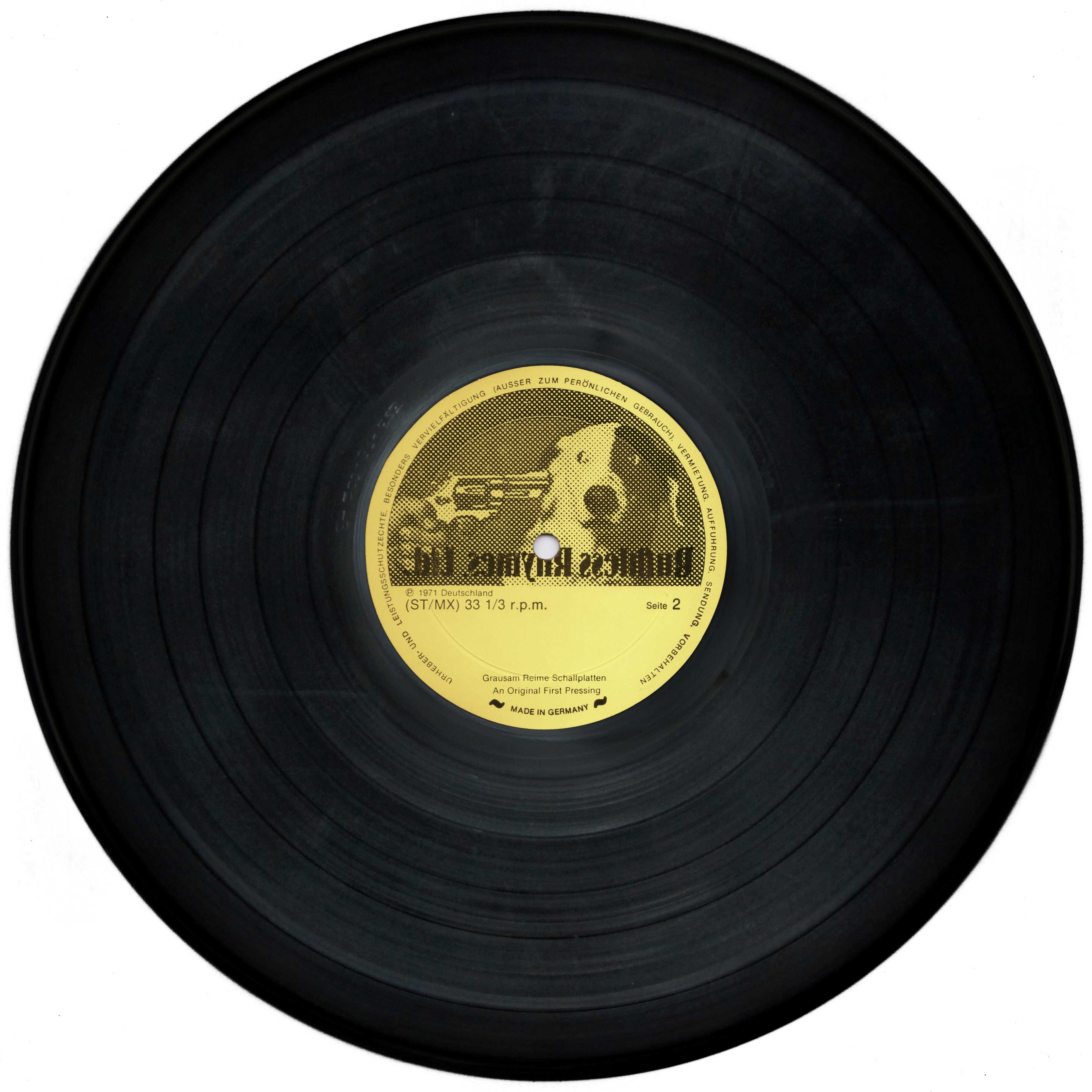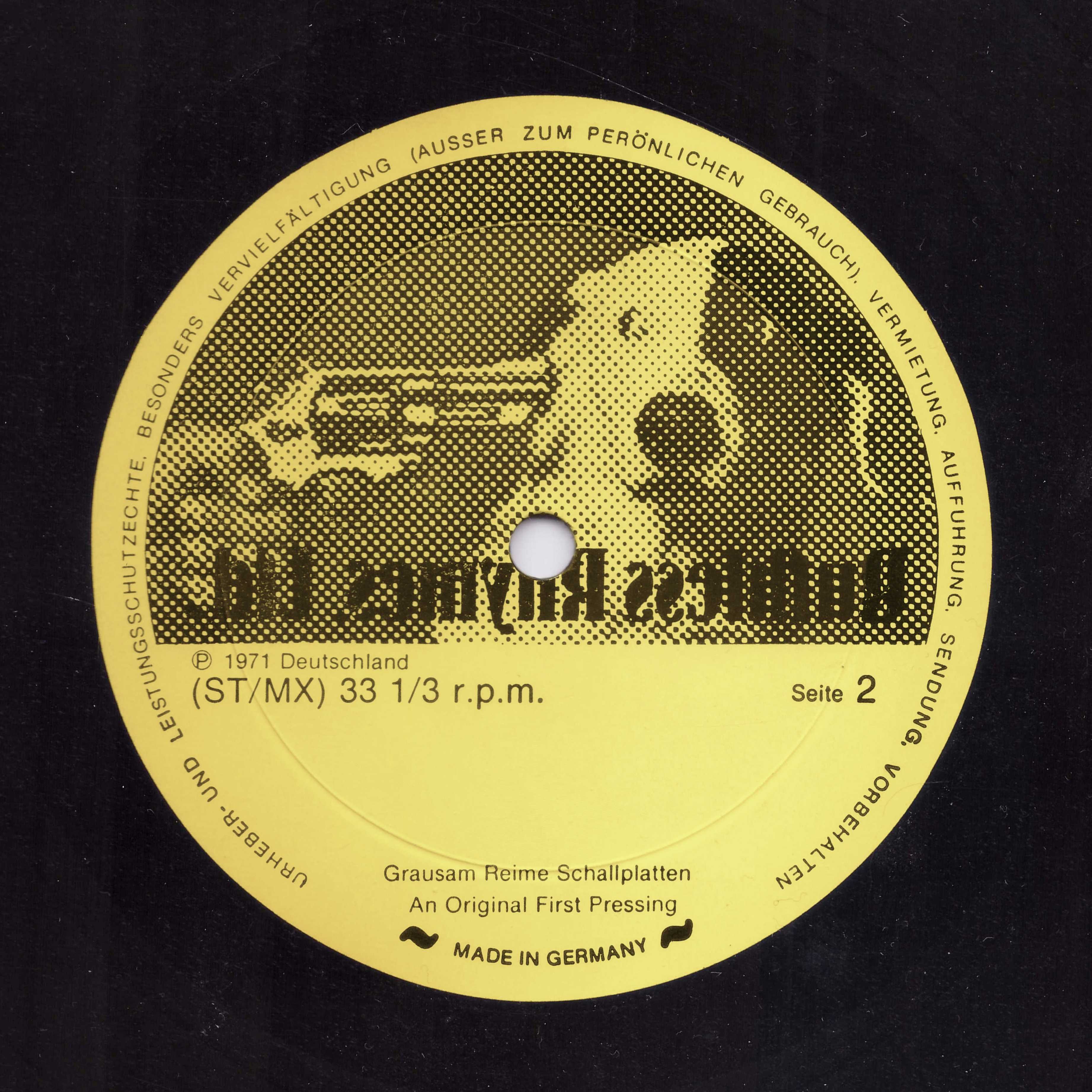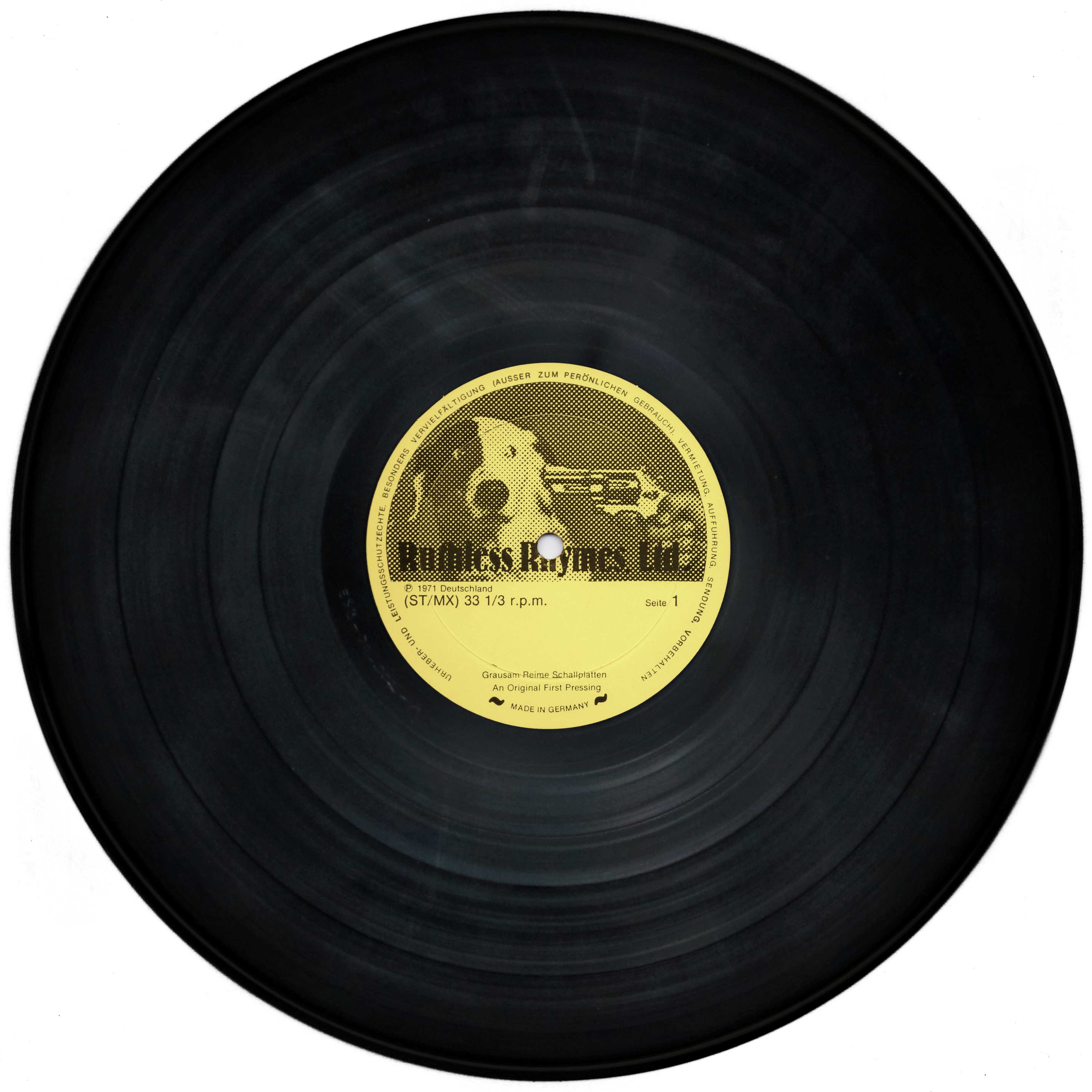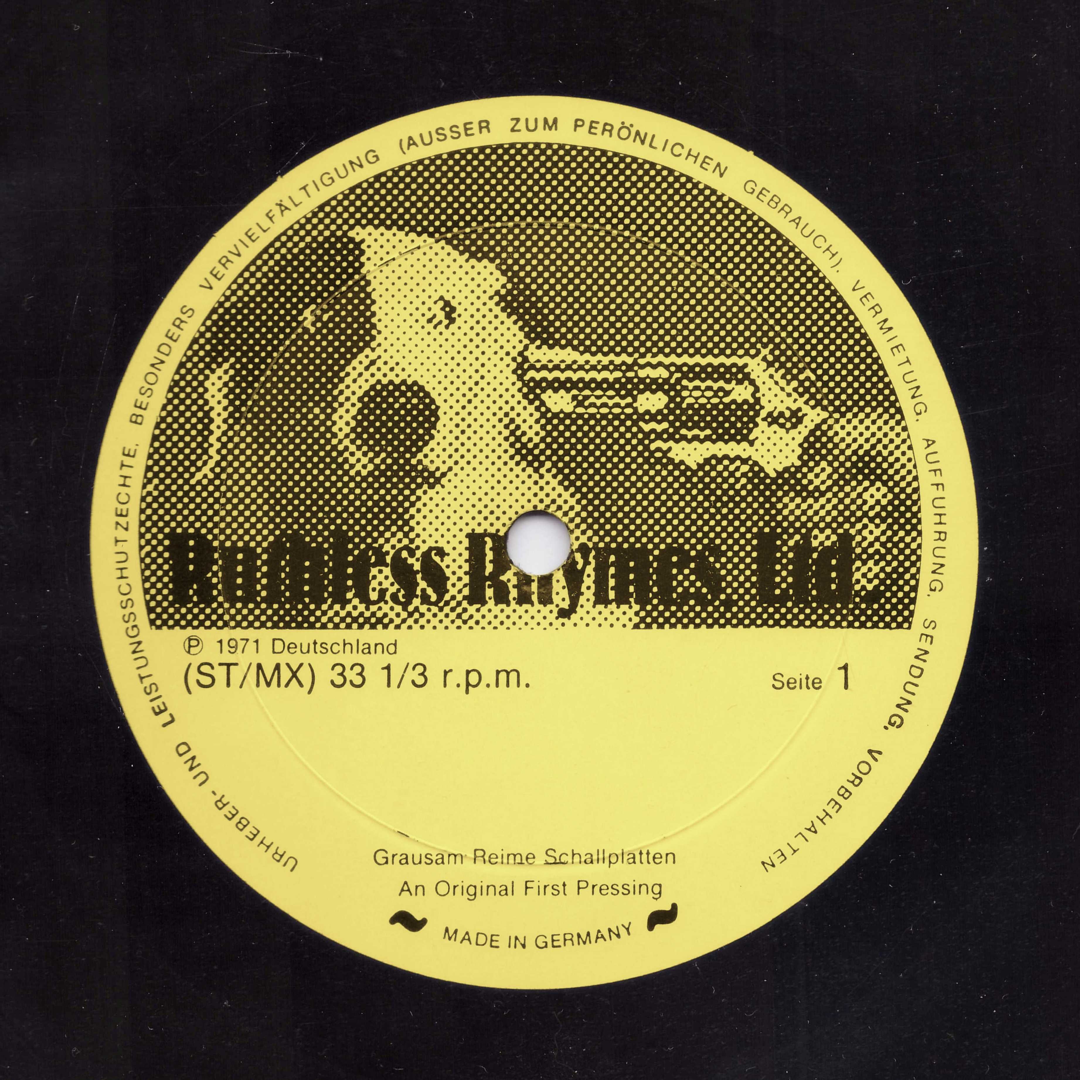The first pressing has Ruthless Rhymes labels on a white background, but there are also copies with Ruthless Rhymes labels on a dark yellow background, matix ESB-75-002, and the cover is a black/white pic.