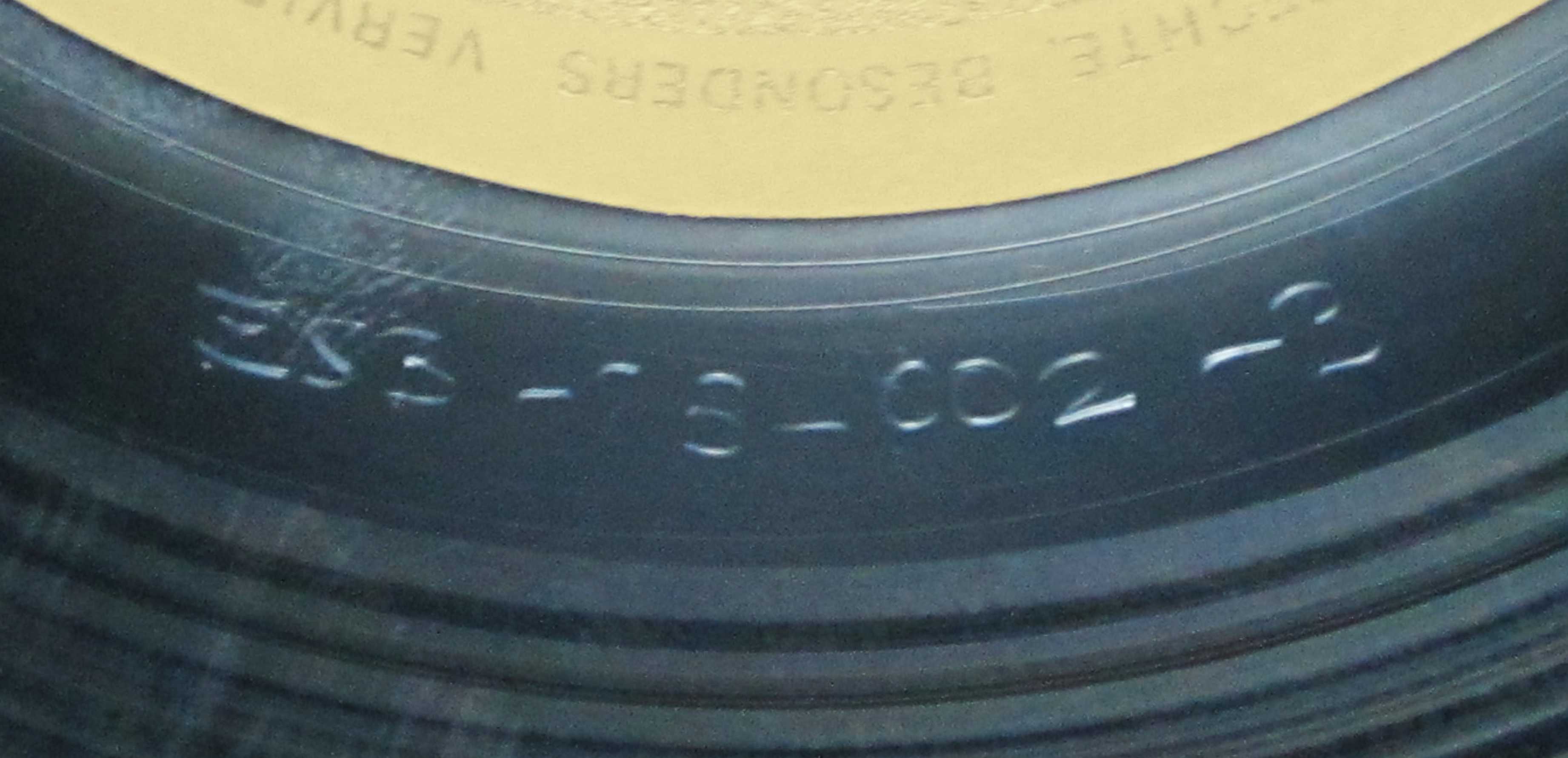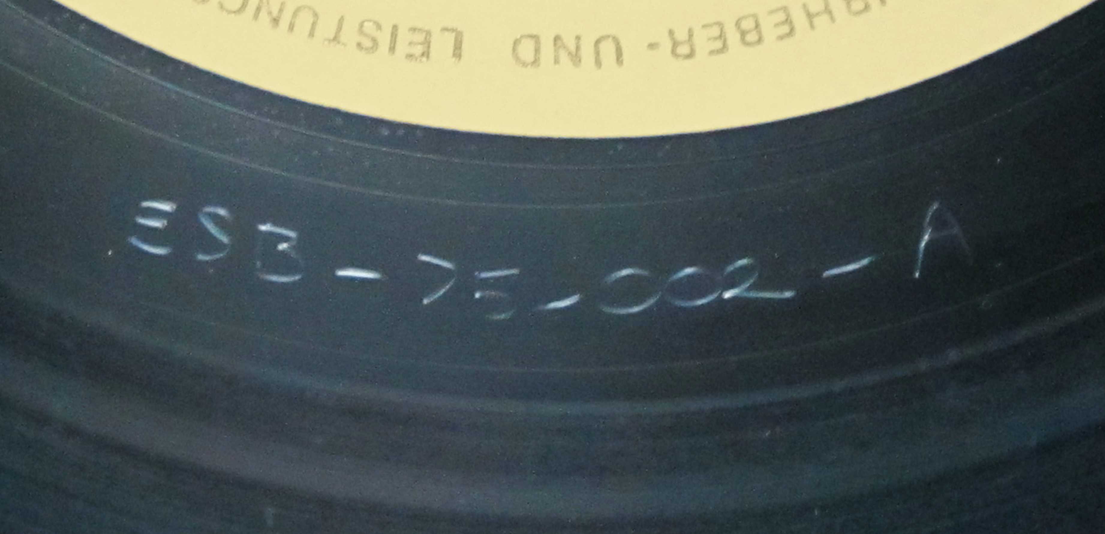 The second print has the same black/white cover or an anonymous white cover with a stamp in the corner saying "Advance Pressing - E Ticket - Collectors Item", the labels are green with a green/yellow Head, the matrices are always ESB-75-002.