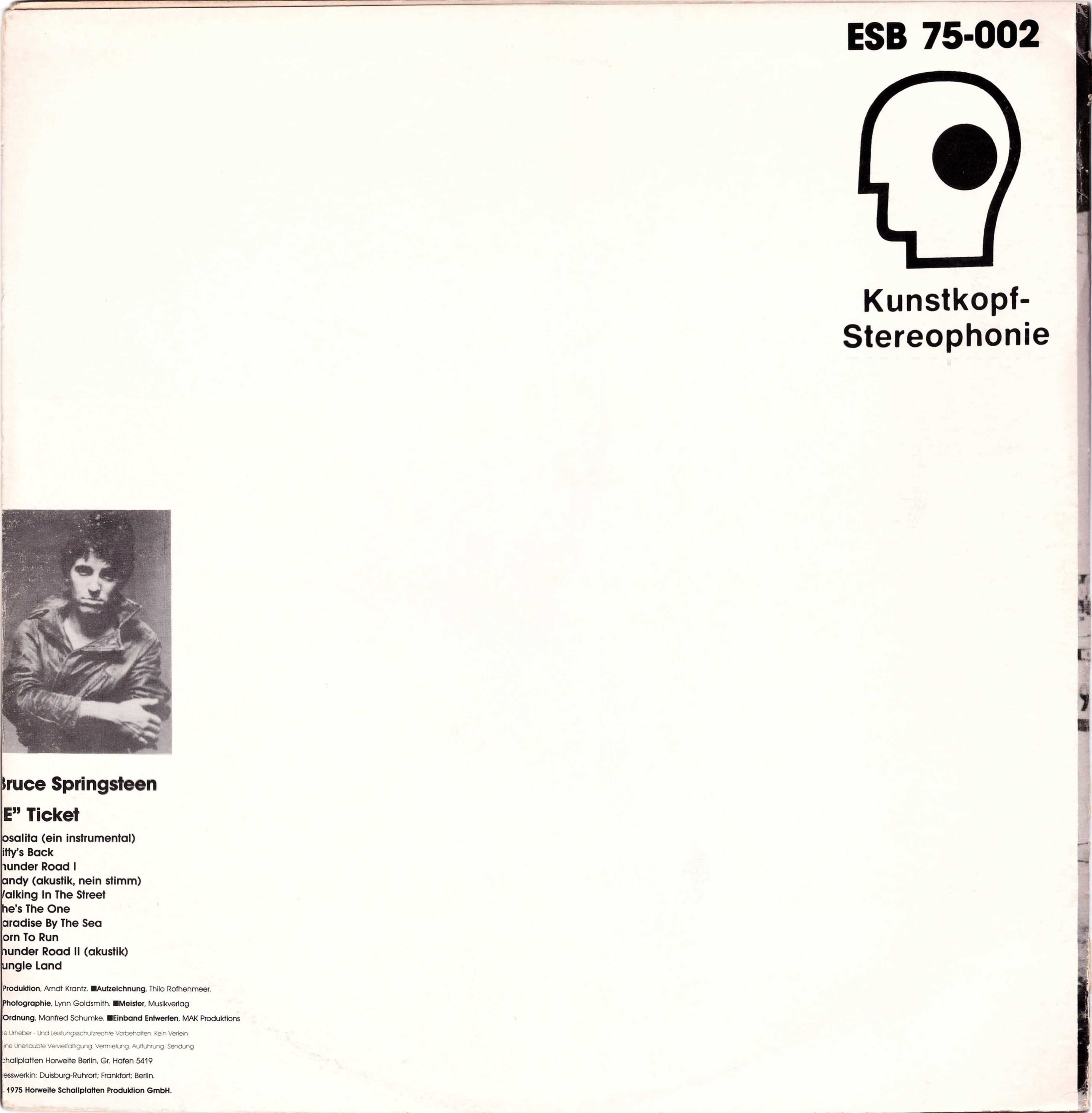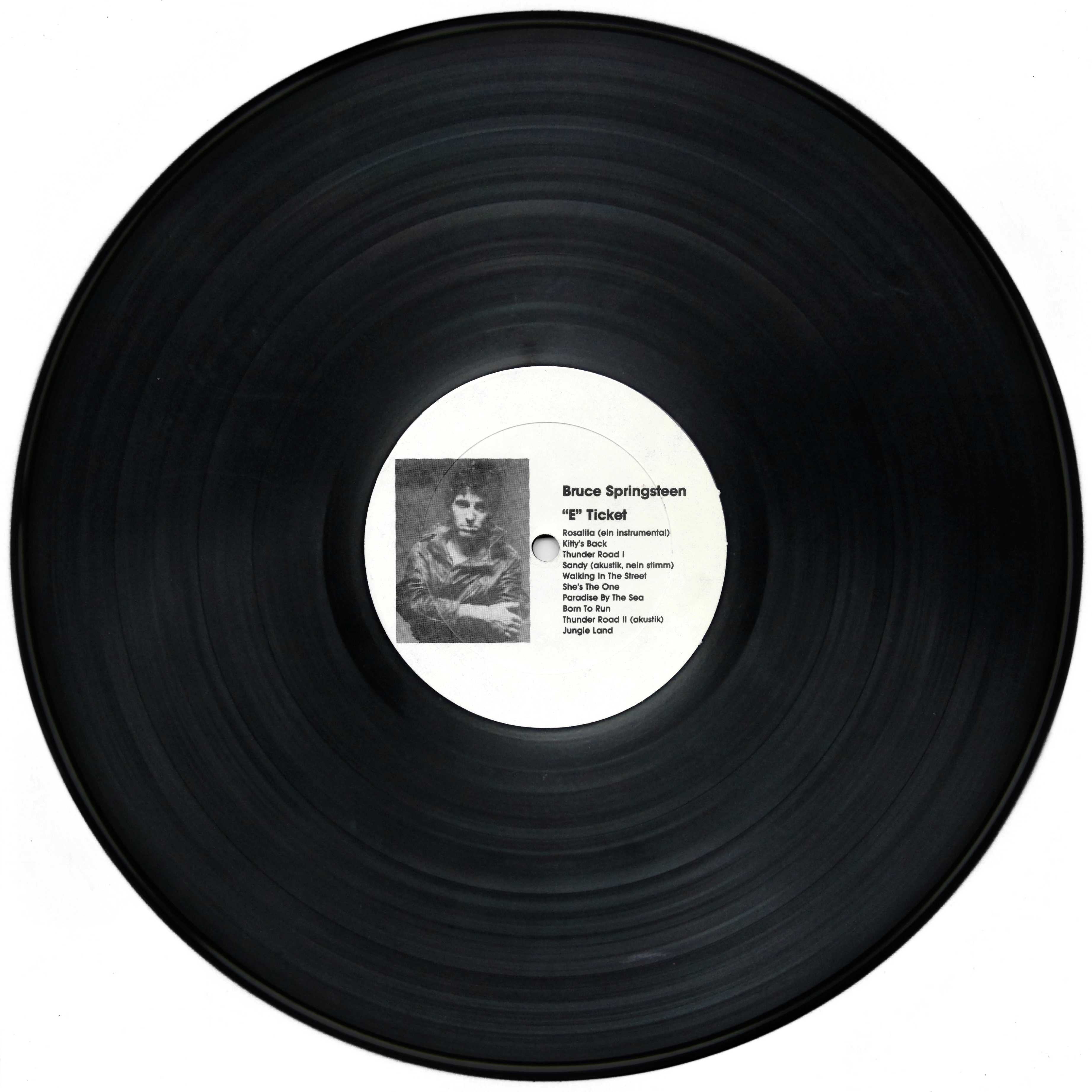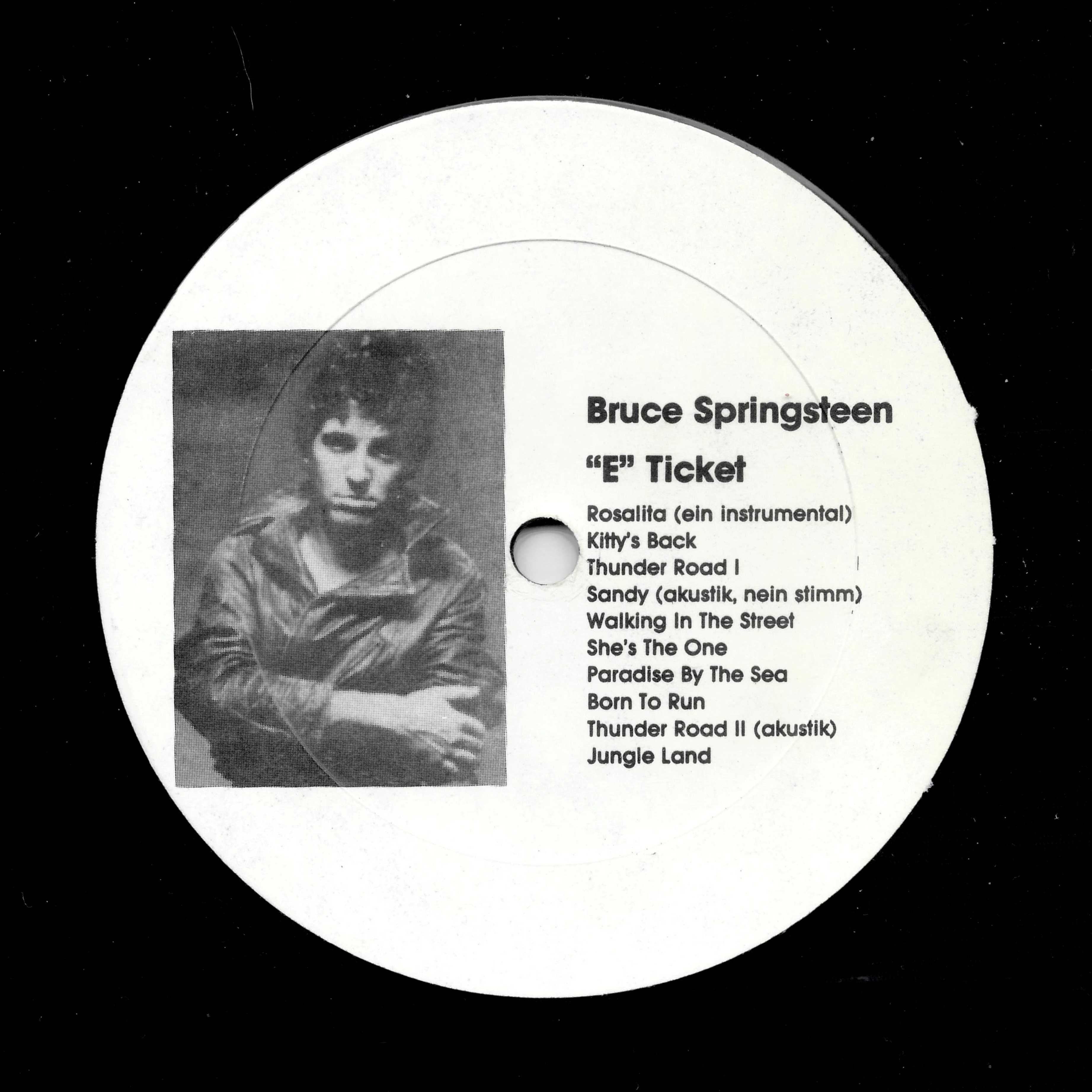 There are also copies with Ruthless Rhymes labels on a white background but with an anonymous white cover with the writing "Bruce Springsteen E Ticket" done with a black marker and a numbering alongside preceded by the hashtag symbol, written with a blue ballpoint pen.