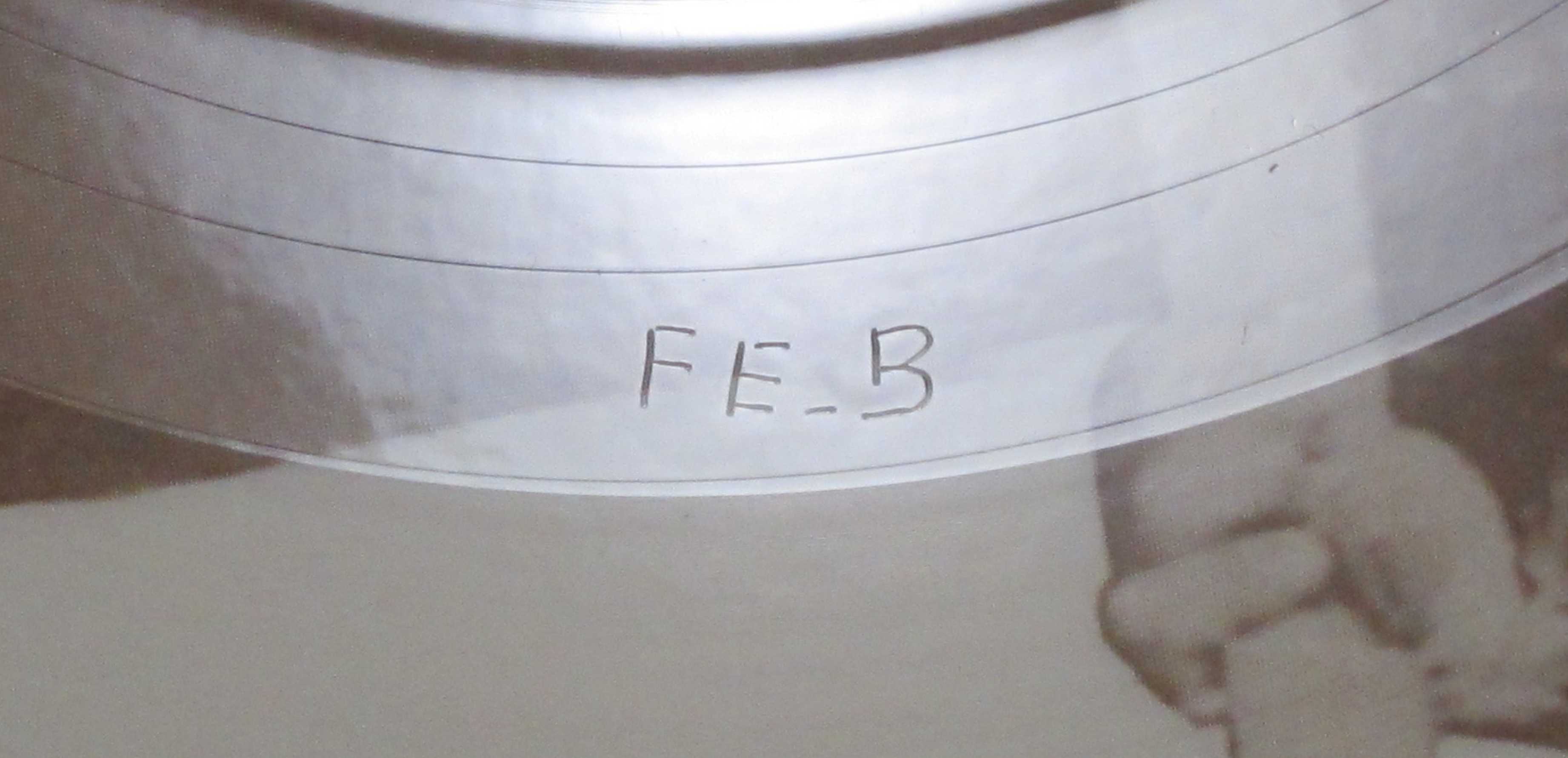 A couple of test pressings were also made to ensure the image was intact and free of tears or defects. Inside the clear sleeve was a white card laminated with the same sticker as the picture.