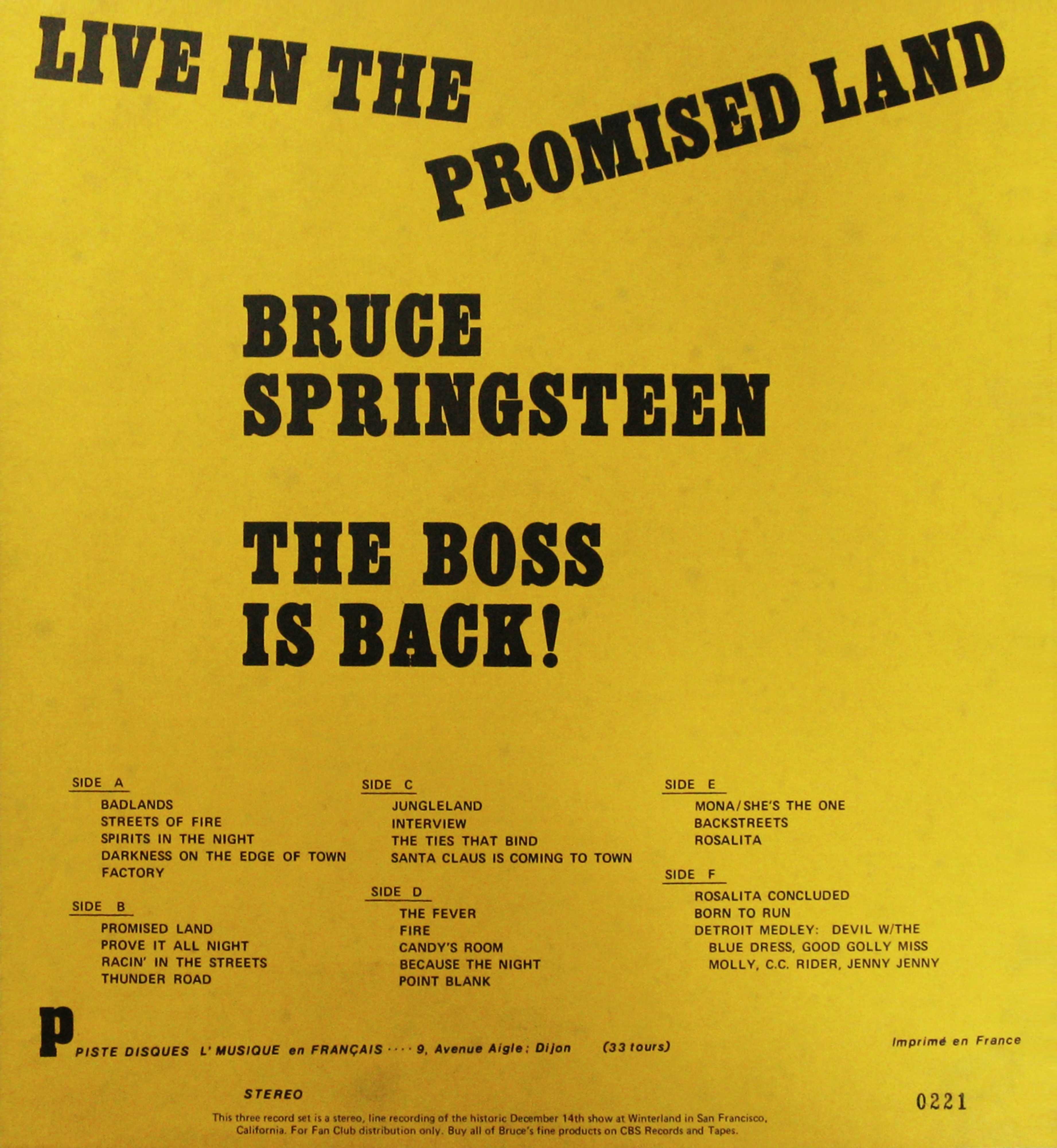 The original pressing was pressed on black vinyl with "Skeleton" labels, with "BS 2978-A/F" matrices, the first 450 copies were packaged in a beautiful black box with a numbered yellow insert, the remaining copies came in a gatefold sleeve with black and white images and a beautiful photo of Bruce inside.
