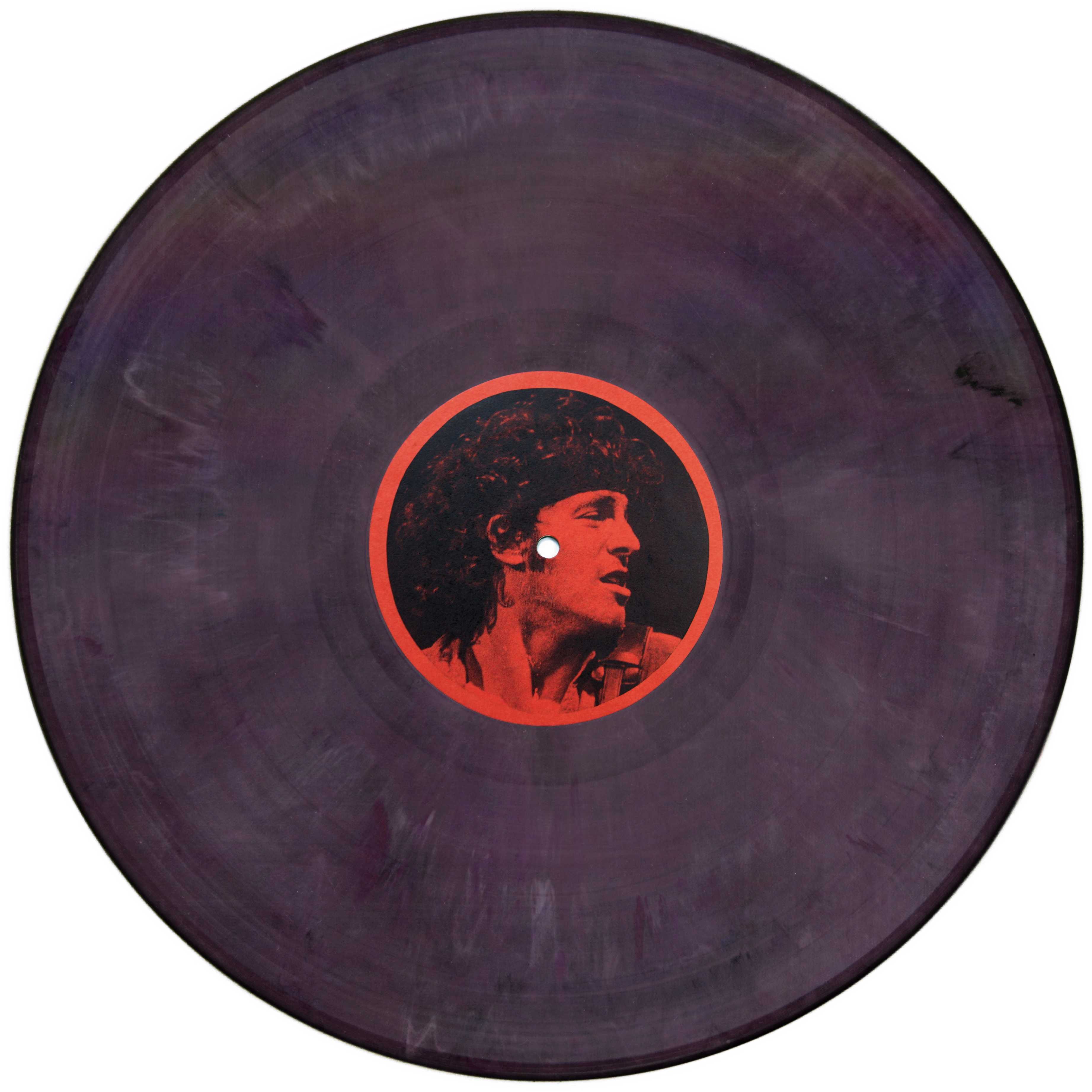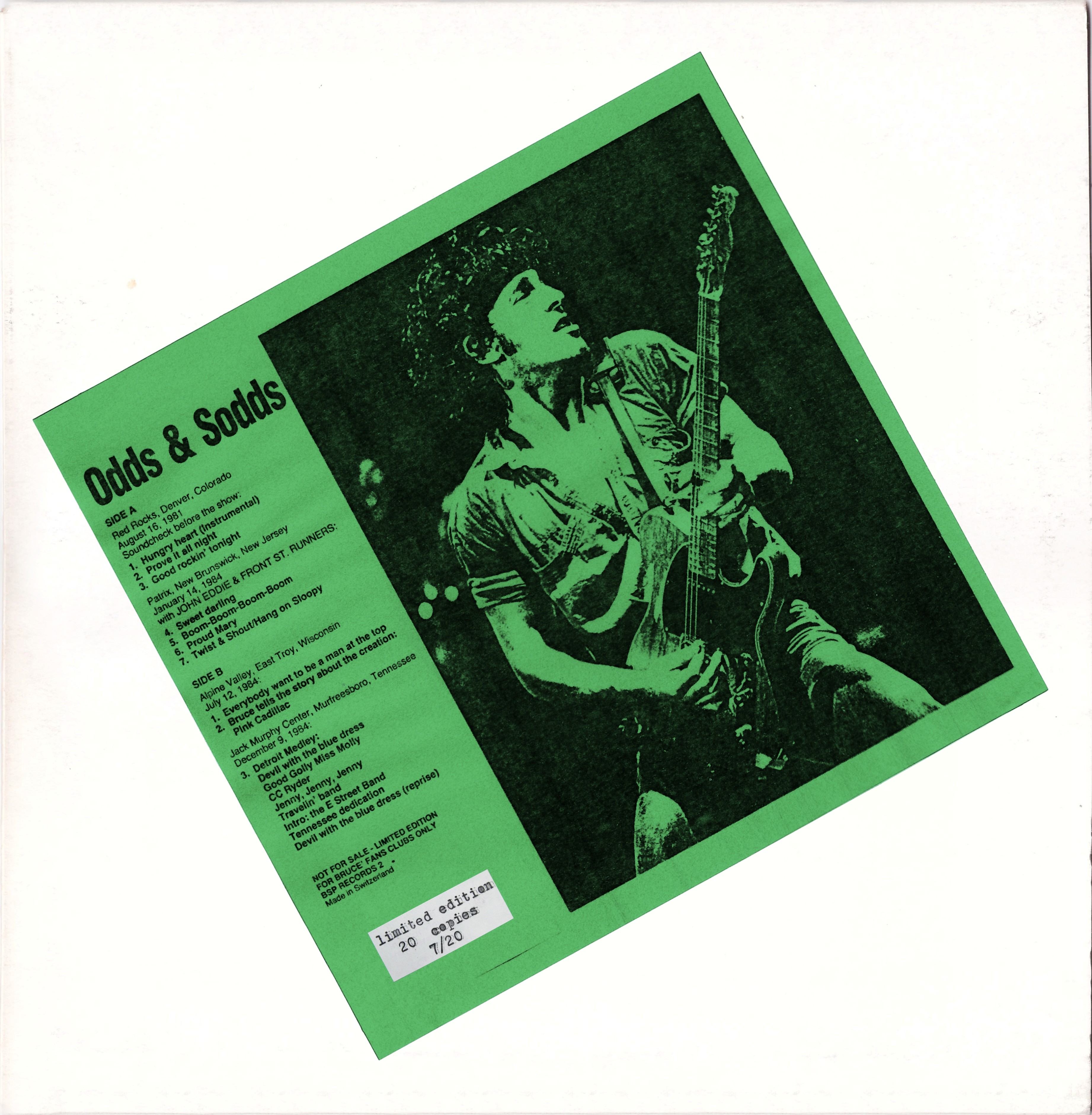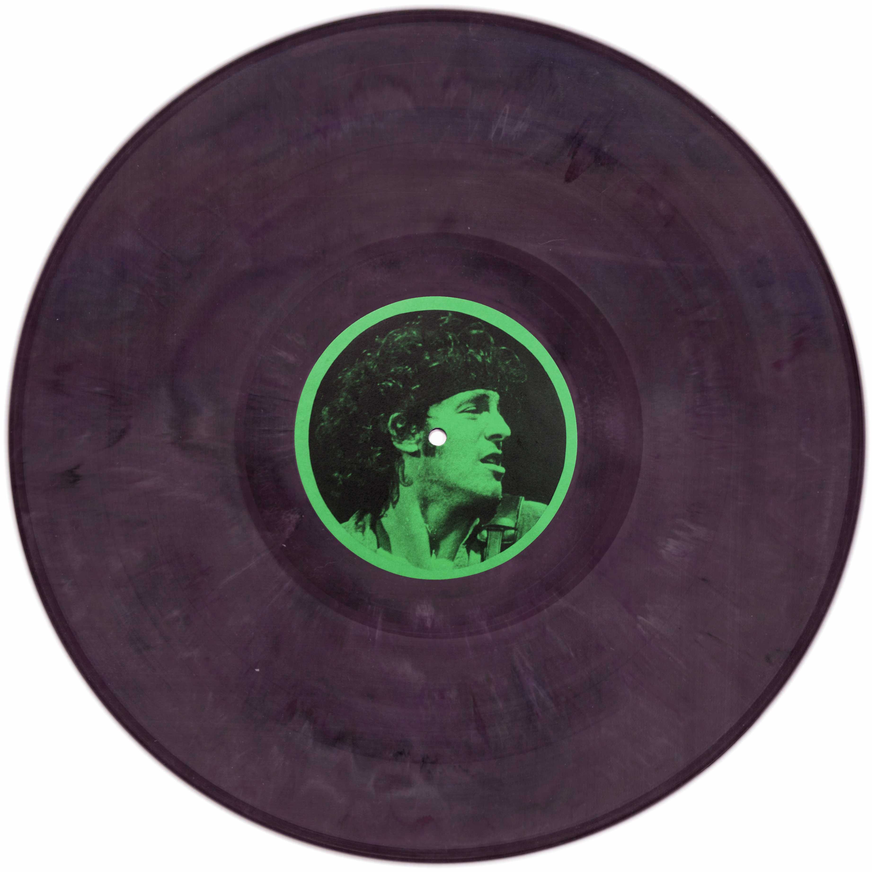In a plain white sleeve, the original pressing of this live compilation is on black vinyl, with a large yellow insert and plain white labels. The second pressing is on dark green vinyl and an orange insert glued to the plain white sleeve, and plain white labels. The third edition, only 20 copies pressed, on multicolour vinyl, with a green insert with a numbered sticker glued on, and labels with Bruce's face, red on side A and green on side B.